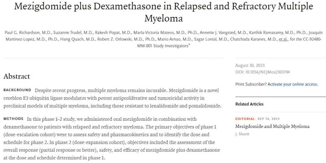 近日,国际权威医学期刊《新英格兰医学杂志》发表了一篇研究论文:一项1/2期临床试验结果表明,Mezigdomide+地塞米松在复发和难治性多发性骨髓瘤患者中显示出良好的疗效。